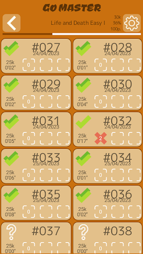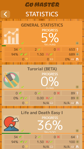 ◼ RESULTS RECORD 💾: Go Master records if you solve a problem on the first attempt or the number of times you needed. It also records times and you can mark your favorite problems. You can also mark problems that you consider to have an error in the correct solution. Your progress will be recorded in all problems and in each particular collection. You will have the best Go trainer you can imagine and you will improve more than with a Go Artificial Intelligence.