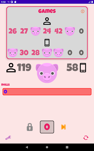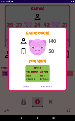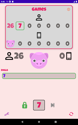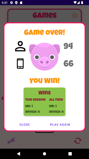 Play against your device over a 7 round tournament. Use each round to build your total score – but be careful, if you roll a 0 you’re a greedy pig & you score nothing for that round. Choose a strategy to score big – it’s not easy to beat your device!