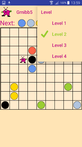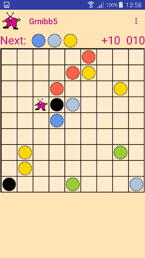 An addictive game, just for fun. Score points by getting five or more circles on a line (horizontally, vertically or diagonally). The Grnibb is used as a joker and represents any colour. The game has three different levels of difficulty.