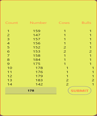 It is a Guess Cows and Bulls game. It is a 2 player game. In this game, the first 1st player has to write a number on the text box and you have to click on the play button to guess the cows and bulls and 2nd player has to guess the number. Cows mean the commonly used number in the guessed number and Bulls mean the commonly used number is in its correct place or not if it is in its correct place the bulls will be 1 and if the guessed number’s number is in the 2nd player’s guess the cows will be 1. If the 2nd player guessed wrong 15 times so he/she will lose and if you guess it right 15 times you will win. Guess the Cows and Bulls and have fun!