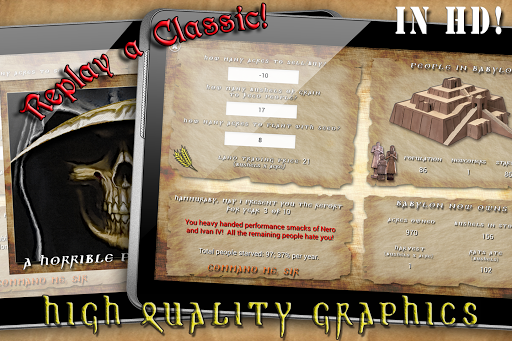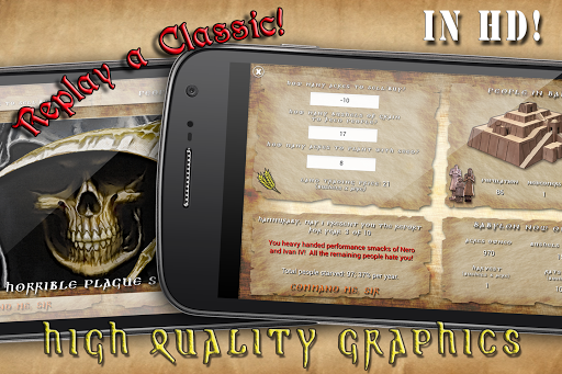 Hammurabi, The Game, is our tribute to a classical computer game. The original game (called Hamurabi, due to limitations of the original hardware in the length of names) was the ancestor of strategy and resource management games and was completely text based. The Android version is enhanced with HD graphics and sound effects. Moreover, some additions were introduced to game mechanism to improve longevity. It’s also possible to play with the original version initial resources parameters.