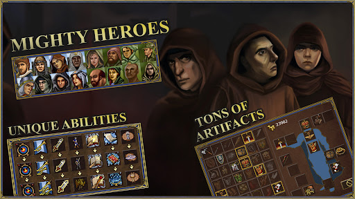 • Tons of ancient artifacts to evolve heroes and increase your skills of war and money, might and magic, leadership and defence mastery.