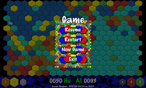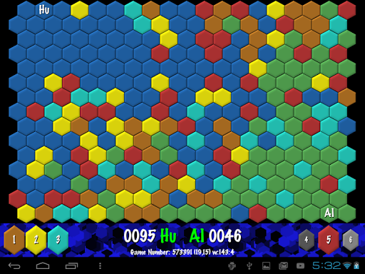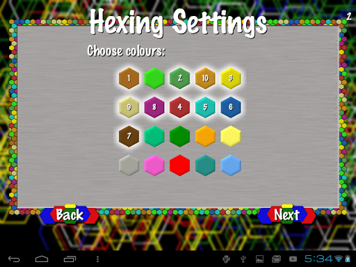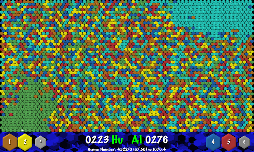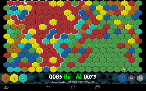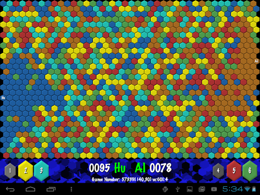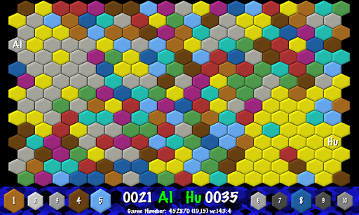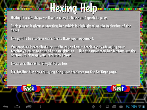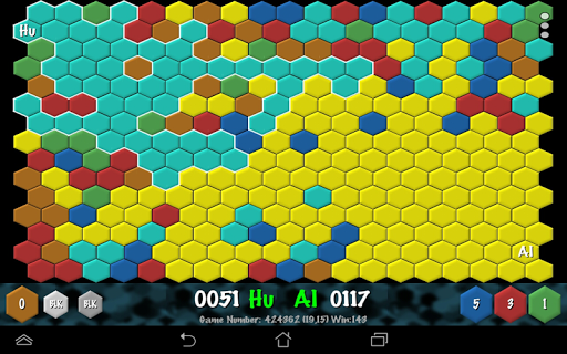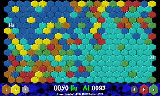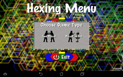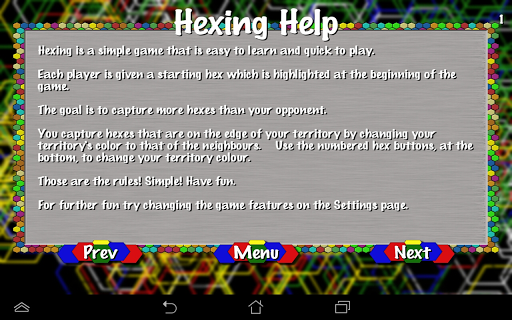 Hexing is played on a board of colored hexagons where each player takes turns adding neighboring hexagons to their owned set. You capture neighboring hexes by selecting one of the colored buttons at the bottom of the screen. The first player to win half the hexes on the board wins the game. Play with the bot-AI or a friend.