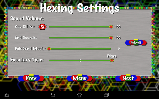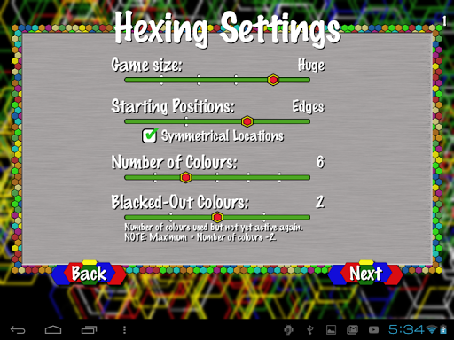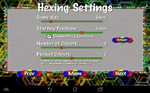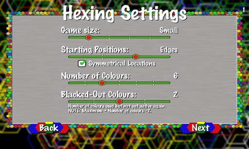 Many variations of the game can be played by changing the game settings on the Settings page. Try different board sizes, change the number of colors, the starting positions or symmetry, or change the number of blocked colors (colors not in play that turn). Sound volumes and ownership boundaries can be controlled in Settings.