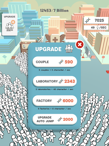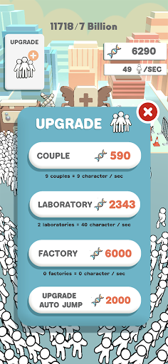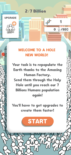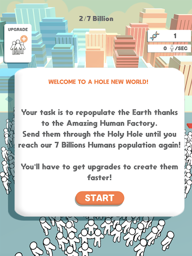Your task is to repopulate the Earth thanks to the Amazing Human Factory. Throw them into the Holy Hole until you reach our 7 Billions Humans population again! You’ll have to get upgrades to create them, and faster!