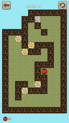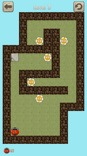 Tap and swipe on the Bug or the Rock to drive bug to flowers, that is his favourite food. Reaching to all flowers in the garden will lead you to complete mission. There is some traps in the garden, let build your strategy to come over and finish mission. There are no limit times or moving turn, have a lot of ways to find out path to the flower, let discovery yourself.