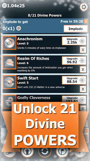 • Get even bigger with prestige! Every time you restart the game, you will obtain Antimatter, which can be used to buy permanent super powers!