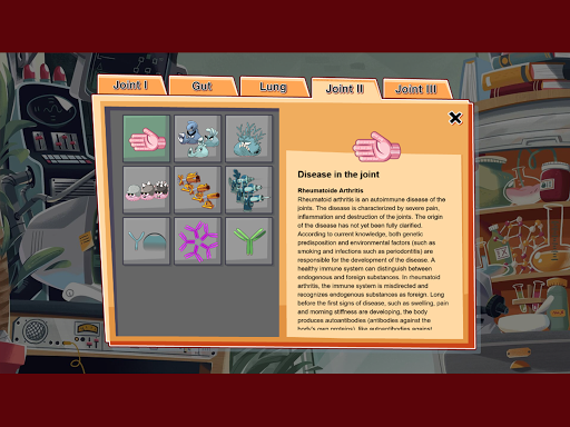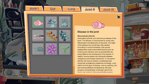 In currently 5 worlds (Gut, Joint Gout, Joint Rheumatism, Joint Rheumatism II, Lung) you learn about complex, molecular mechanisms and drugs with their effects and adverse reactions.