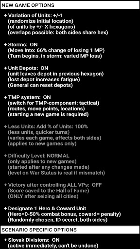 + Settings: A massive list of options are available to alter the look of the gaming experience: Change difficulty level, hexagon size, resources, Animation speed, choose icon set for units (NATO or REAL) and cities (Round, Shield, Square, block of houses), decide what is drawn on the map, and much more.