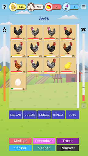 Como o nome diz, esse é um jogo de galo e é um jogo de galinha também. É um jogo de gerenciamento de recurso e seleção genética numa criação de aves.