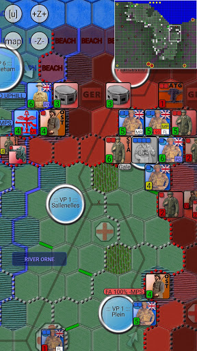 You are in command of the Allied force carrying out the eastern part of the famous 1944 D-Day landings (Juno and Sword beaches). The scenario, which models units at battalion level, starts with the British 6th Airborne Division dropping during the night to secure the key bridges and destroy artillery concentrations. The main objective was to seize the crucial city of Caen as soon as possible, which the German armed forces ended up fiercely defending with a handful of battle-hardened Panzer divisions.
