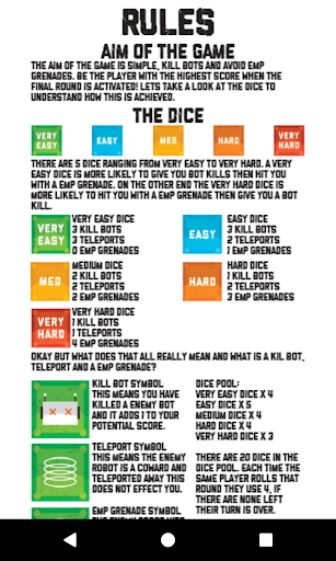 Get ready for the ultimate bot-killing experience! Killer Bots is the dice-rolling game where you must defeat enemy bots while avoiding EMP grenades. With up to 12 players on one device, this game is perfect for groups of friends. Roll the dice and try to get the most bot kills while keeping your EMP hits below 5. With 5 types of dice and 20 in the pool, each with different symbols, the game becomes more challenging as you progress. Activate the last round by reaching 20 bot kills and try to beat your friends’ scores. Don’t miss out on this must-have game!