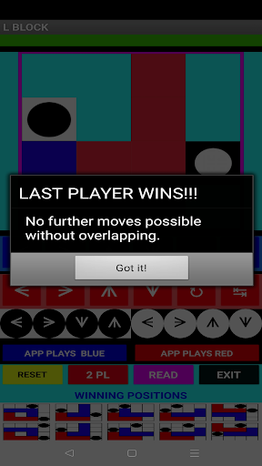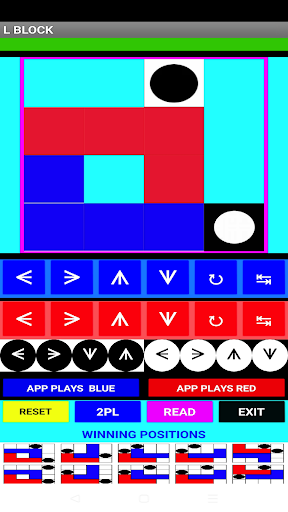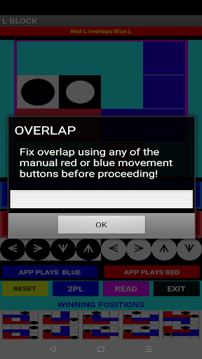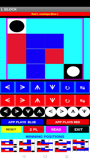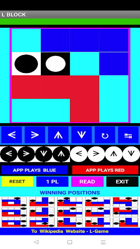 Move the blue or red L , then the neutral block buttons to place the pieces. Then press the red [APP PLAYS RED] / [BLUE PLAYS RED] button for the computer’s move.