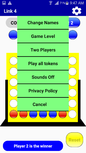 – Option to change the scoring method, connect 4 tokens or play all tokens.