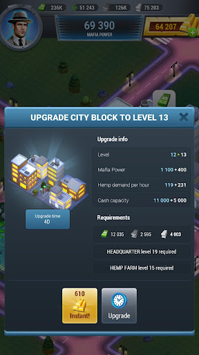 Your goal in Mafia World is to dominate the world of crime and mafia. Manage and expand your mafia empire by producing goods and participating in illegal activities to generate cash.