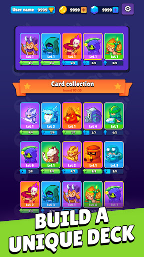 Choose unique Cards to your Battle Deck and head to the Arena for Battle! There are no “weak” or “strong” decks – collect, merge, learn to play your army well and level up units you use most. Place your Cards right and destroy enemy heroes.