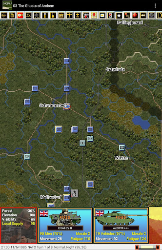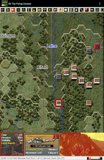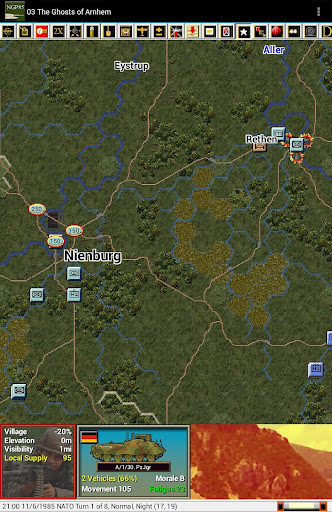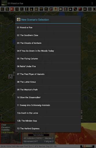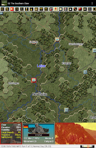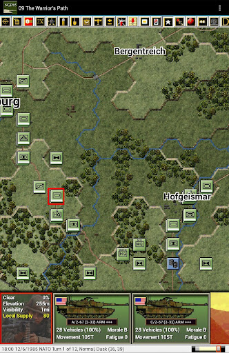This is a paid release in the mobile Modern Campaigns series. You should first install and play the free Panzer Campaigns and Modern Campaigns apps by John Tiller Software to become familiar with the interface and ensure that the app runs on your device. This release includes 14 scenarios from the North German Plain ’85 PC game where you play the Warsaw Pact commander in 5 scenarios and the NATO commander in the remaining 9. Note that this release has larger and longer scenarios than normal for our apps given both the nature of the north German terrain and changes by the designer to provide longer playing scenarios as requested by players in earlier game reviews.
