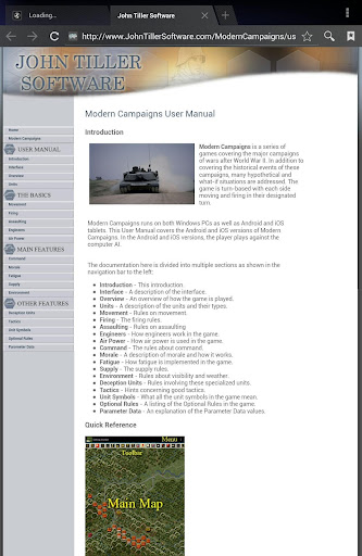 Modern Campaigns is a detailed turn-based simulation of operational warfare after World War II through present day. It includes detailed rules and combat resolution but has a simple interface that allows the player to focus on strategy and tactics. A wide variety of unit types are represented including infantry, tanks, artillery, and engineers. In addition, modern warfare is addressed in this game engine including chemical and nuclear warfare, electronic warfare (signal intelligence and jamming), and thermal sights.