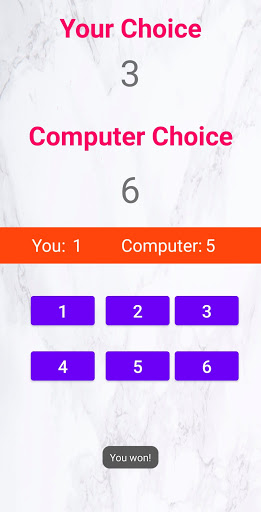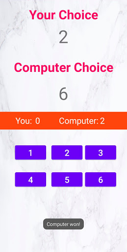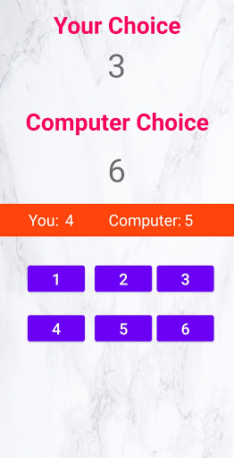 At the first, one has to choose either odd or eve. After that one has to click on one of the buttons given of 1, 2, 3, 4, 5 and 6. Then the computer makes a random choice. If the sum of your and the computer choice is either odd or an even number, then either you or computer wins based on your selection of odd or even at the start.