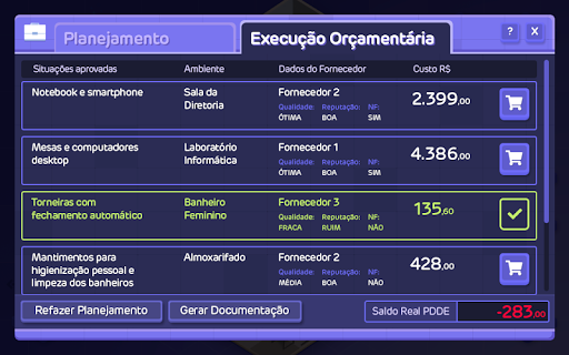 (3) Chegar ao final da partida com os parâmetros de satisfação positivos e acumular o máximo de pontos possíveis para alcançar a melhor posição no ranking individual e por escola.