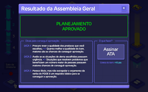 Ao final, o jogador conhecerá as etapas do processo de (re)cadastramento de uma UEx, conhecer os principais mecanismos de administração de uma UEx, identificar os tipos de recursos recebidos por meio do programa e como utilizá-los, definir quais benfeitorias podem ser aplicadas os recursos, entender o processo de realização de uma benfeitoria, desde a pesquisa de preços, cotação de propostas, definição de prioridades e execução de tarefas e compreender como é feita a organização e gerência dos recursos do programa para que a prestação de contas seja realizada com sucesso.