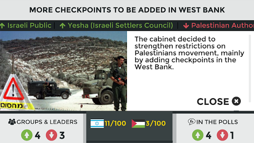 •	PeaceMaker is two games in one: play both the role of the Israeli Prime Minister or the Palestinian President.