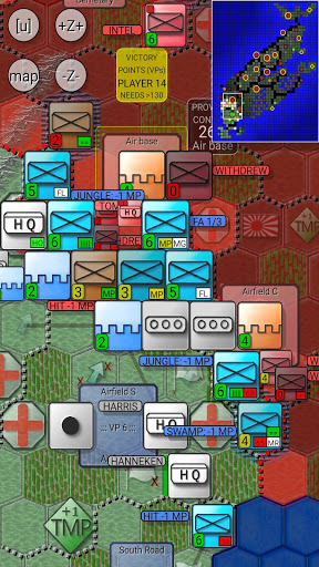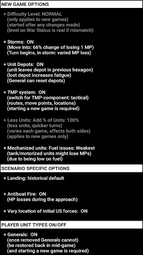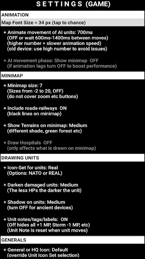 + Settings: A long list of options are available to alter the look of the gaming experience: Change difficulty level, hexagon size, Animation speed, choose icon set for units (NATO or REAL) and cities (Round, Shield, Square, block of houses), decide what is drawn on the map, and much more.