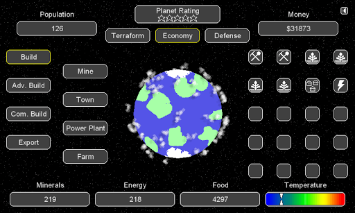 You have become the owner of a deserted planet. You need to use your skills to develop the planet into the number one destination in the galaxy! But keep your guard up because the better your planet is the more attention you will draw from pirates wanting to steal your resources.