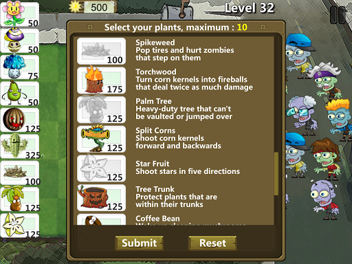 You must survive 3~5 rounds to complete a level. You can select 10 plants at the beginning, and then not allowed to change between two rounds.