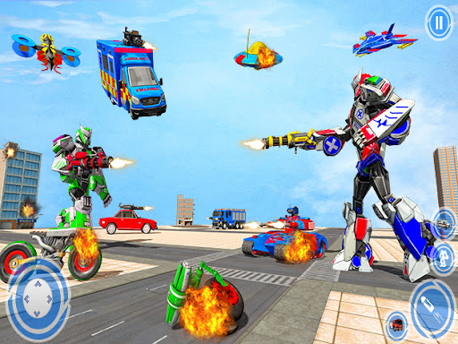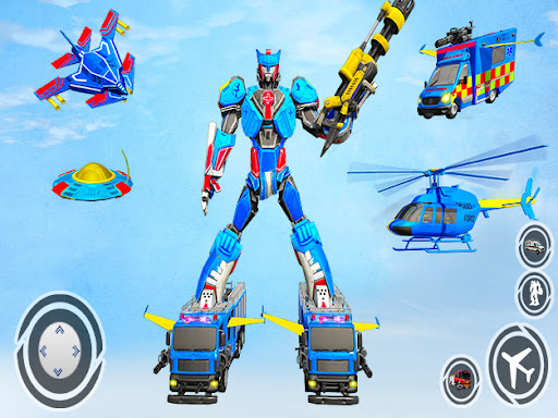 Here we are welcome to the truck ambulance flying robot games. Here you will play different levels and enjoy flying robot games and truck ambulance flying robot. In the realistic fire truck ambulance game, you got adventure and save all the firing buildings and people from fire. The theme of the game is to rescue people from fire buildings and catch the fire rings with a flying robot and robot truck. In the fire truck robot game, you have to face challenges to save humanity from fire buildings and trapped them from fire. At every level of the robot game, truck ambulance flying robot you will enjoy and learn rescue skills. How to save humanity in an emergency with fire truck? You can select different types of the truck ambulance. Police fire truck ambulance game or truck ambulance is an updated flying robot game with multi-features.