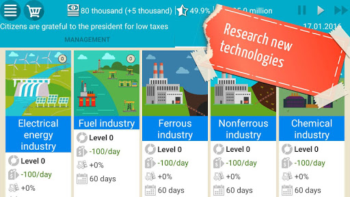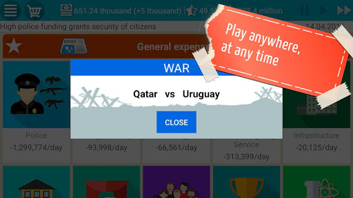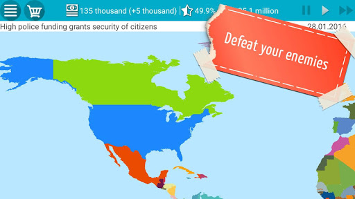 Are you sure? Prove it! The “President Simulator” game lets you rule one of the 163 modern countries. Politics, the media, espionage, natural disasters, wars, taxes, crime fighting… Show your strength, wisdom and perseverance. Build a superpower that dictates its rules, otherwise the world will smash your country.
