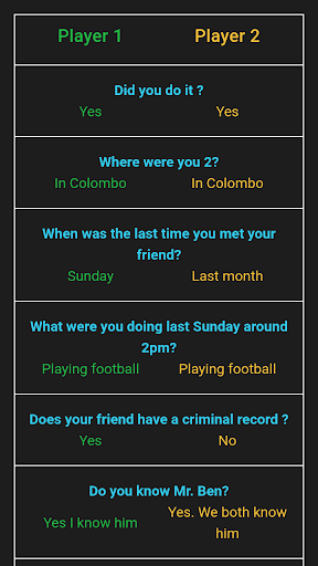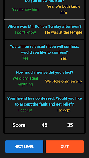 In this game 2 suspects are caught for given crime. They are questioned one by one by the police. The future of them depends on how they respond. As each candidates are blind about what other person say, player must carefully decide how to answer. App plays the role of one suspect and the player has to play the other. Player must earn higher points than app’s AI character to progress into next level.