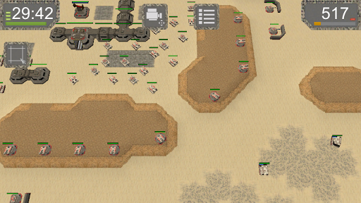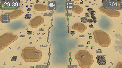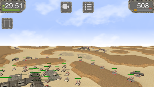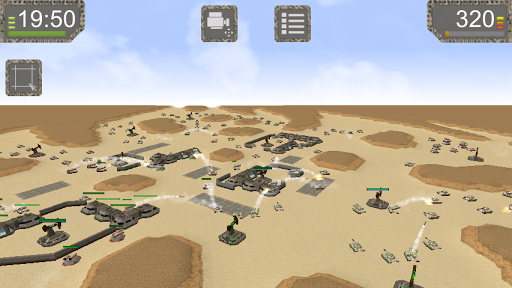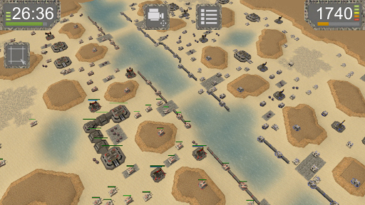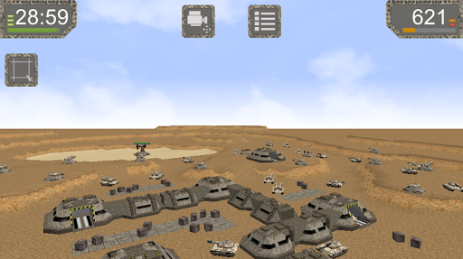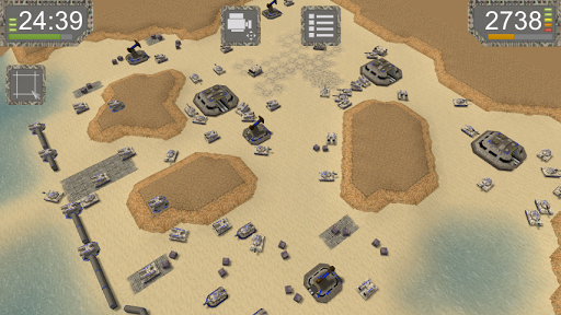 At your disposal a many types of units: tanks, lasers, rocket launchers, stationary guns. The plant will allow you to build additional equipment, the main thing is not to spend more than you need, because for the passage of each mission you need to collect a certain amount of resources for a limited time. Also, use the advantages of the landscape, it’s not hard to be a combat unit, the further it can fire. Don’t leave your oil pumpjacks unattended the enemy is insidious and won’t miss the opportunity to capture them. Resources can also be extracted from the ground if you use harvesters. Harvester filters the sand saturated with carbon and metals (the black patches on sand), after which payload mass is delivered to the base, and player gets points. For speed up / slow down game use the button in the upper left corner. The button in the upper right corner opens a dialog with a reminder of the mission purpose. The dashes in the upper right corner show the current number of oil rigs you have captured.
