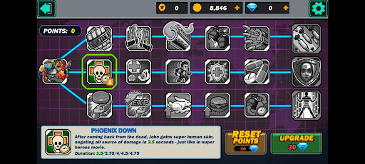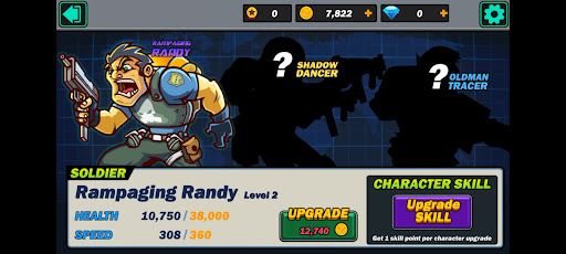 Upgrade the skills of your metal soldier (such as superhuman skin, immense speed, shields, and more) by getting skill points. You can also upgrade skills by gems and reset skill points whenever you want. Alternatively, unlock other characters besides Rampaging Randy, such as the Shadow Dancer and Oldman Dancer.