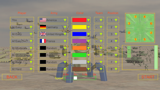 In SinglePlayer mode the player can choose the country, location, color and fight with up to 7 AIs.