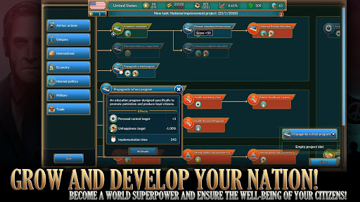 Realpolitiks is a streamlined real-time grand strategy game that allows you to become the leader of any contemporary nation. Dive deep into the issues of the modern world, with its current geopolitical borders, using your country’s power and economic strength to engage in military conflicts and international affairs. Choose your own method of coping with other nations’ interests, unexpected events, global threats and various crises. Deal with the disintegration of the European Union, terrorism, the aftermath of World War III and many other real and fictional scenarios.