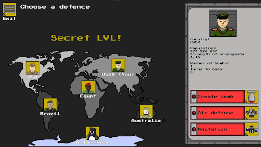 Red Button is a turn-based strategy game set in world war. The game takes place in a parallel universe in 1978. Choose the country you want to play. Your goal is to remain the only survivor of this war. Try to predict the enemy’s attack, use propaganda, sabotage or bombardment to win. There is always only one winner.