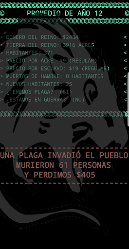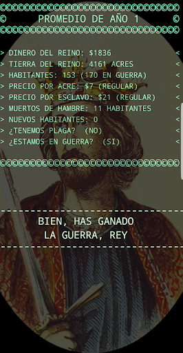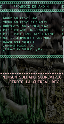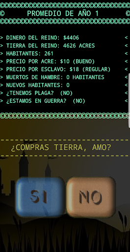 Cada etapa del juego representa un año. Al comenzar cada año te informará los recursos con los que cuentas. El dinero total, la cantidad de tierras que posees medidas en acres, la cantidad de habitantes, el precio de cada acre y el precio de ventas de los esclavos capturados en las guerras.