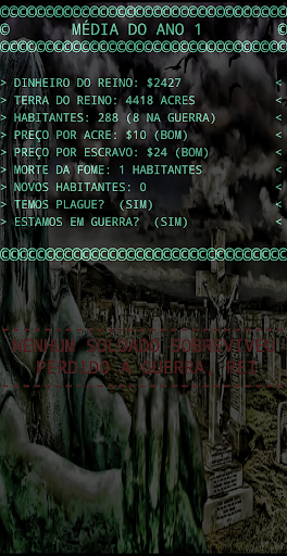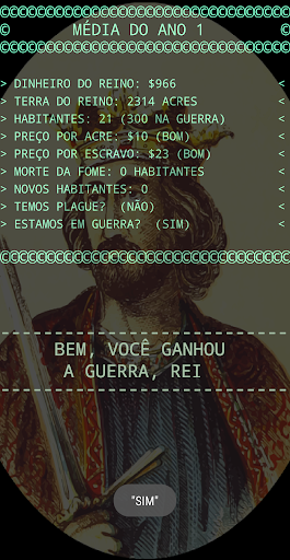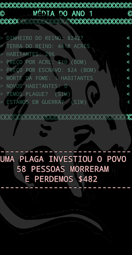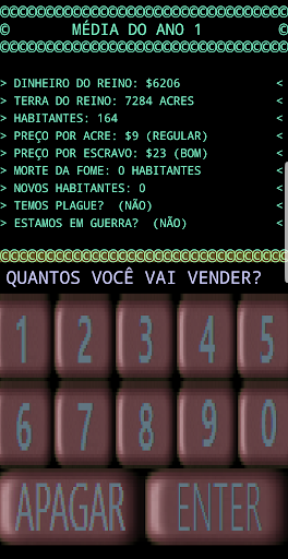 Cada etapa do jogo representa um ano. No início de cada ano, ele informará sobre os recursos de que você dispõe. Dinheiro total, a quantidade de terra que você possui medido em acres, o número de habitantes, o preço de cada acre e o preço de venda dos escravos capturados nas guerras.