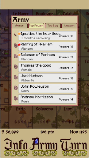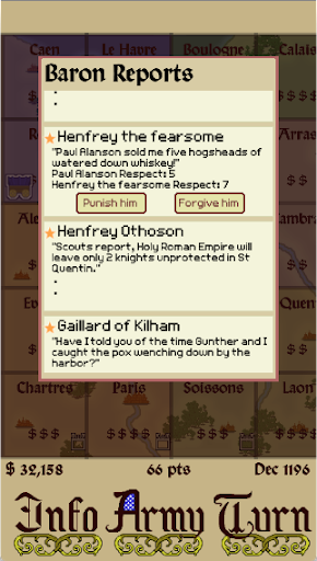 Respect of the Realm is an authentic economic and tactical simulation where the goal is to keep one step ahead of your enemies. Manage your knights, upgrade your weapons, and compete for strategic territories. Use spies to track down your rivals’ supply wagons, infiltrate enemy defenses, bolster your own defenses with heavy weaponry and send your toughest knights on raids into enemy territory. But don’t forget to keep an eye on your own men; RESPECT is everything and disloyalty is your greatest enemy. If a soldier steps out of line, you need to respond. Settle disputes, quell rebellions, promote your barons, throw lavish feasts, track down valuable rumors, secure rare weapons and appease the church with well-placed donations.