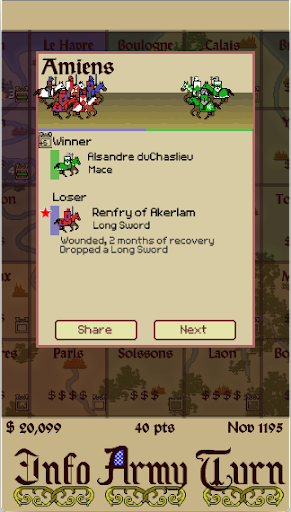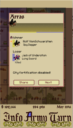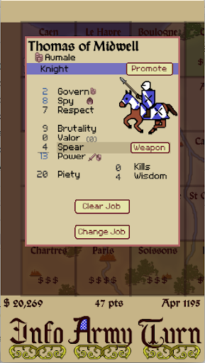 For fans of Respect Money Power, this game builds on the same engine with enhanced game tuning and the following additions: Fortifications & Infiltrators, More weapons, Armor, Shields, Truces, Duels, Wisdom stat, Easier ‘easy’ setting, Harder ‘hard’ setting, Faster end-game, Ability to turn off the tutorials, More advice events, More recruitment options, Modified Respect, Piety and Valor systems, and Assassins.