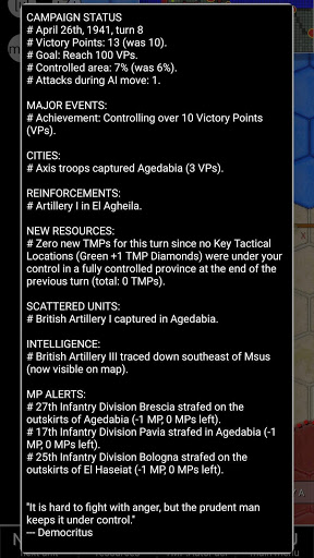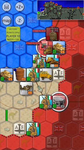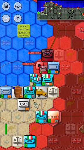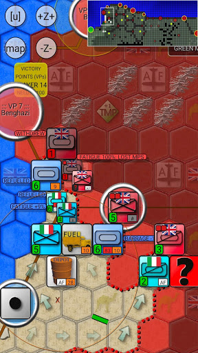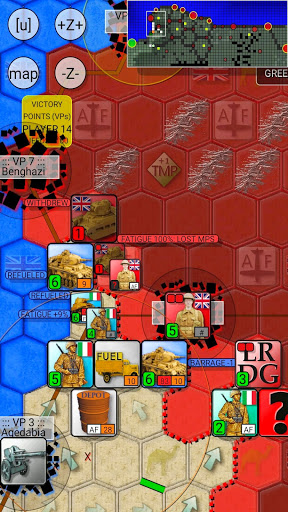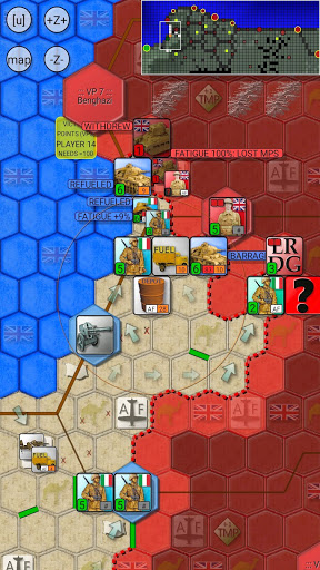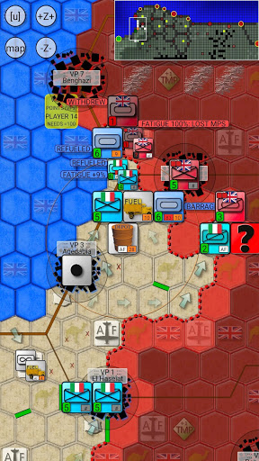 Supply Rules: To keep your armored and motorized divisions on the move you must use Fuel Trucks to transport fuel from Fuel Depots to front line units. Fuel Depots can be refueled only from El Agheila (unlimited amount) or Tobruk (limited amount). Meanwhile only El Agheila and Benghazi provide food supply, so units must have a route to either of these cities after the British forces have moved.