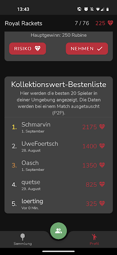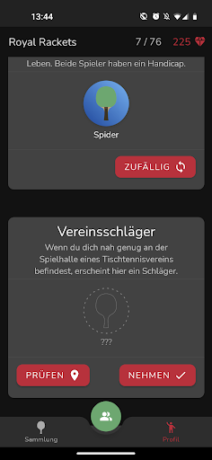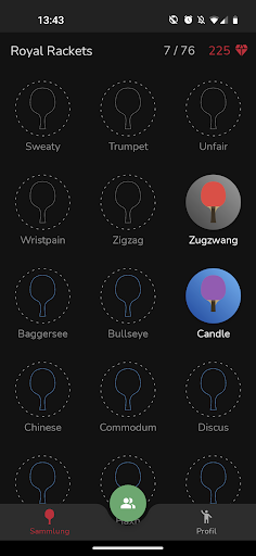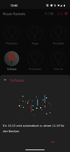 Royal Rackets ist ein Sammelspiel, bei dem man virtuelle Tischtennisschläger sammelt. Jeder Schläger hat eine Spezialfähigkeit, die in einem echten Tischtennismatch (Satz bis 11) zum Einsatz kommt. Zwei Spieler setzen einen Schläger ein, und ein Handicap-Satz wird gespielt. Der Gewinner bekommt beide Schläger. Das Spielen funktioniert über Bluetooth.