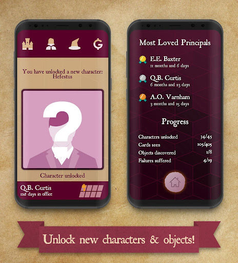 The game includes hundreds of different cards, dozens of characters, magical creatures and various secrets. Each game you play will help you unlock new content, and the game will save your progress, including a ranking of the Principals who held the most time in office.