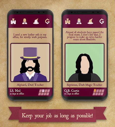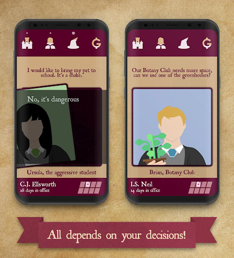 You are free to be hard with the students. On the contrary, you can also be benevolent with your students and teachers, but rebel against the Ministry. Your decisions will be key to decide the future of your school. Your answers will affect not only the current state of the castle and the welfare of your students, but they will also affect future events and the fate of your School of Magic.