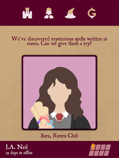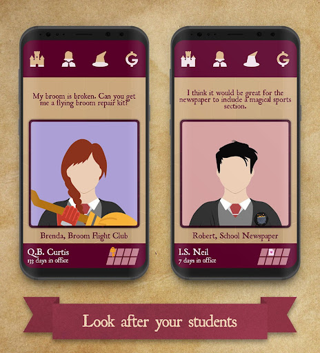 Students, teachers and other witches and wizards will come to you for help or advice. Other characters from the magical world will give you a hand, but some will put you in a tight spot. You should be careful, if you want to become the best Principal in the history of this magical school.