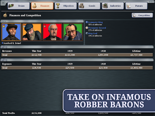 Grow profits through efficiency, innovation, and shrewd business decisions as you acquire valuable patents, trade stocks, and build or buy industries. Compete with world leaders and industrial titans to achieve the ultimate goal — becoming the greatest railroad tycoon of the age!