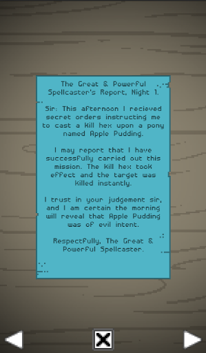 You are Captain Silvermane, sent to a quiet little pony town by the Princess of the Sun herself to investigate reports of dark magic and murder.On arrival you find only a handful of terrified ponies remain. Among the innocent townsponies is a murderous gang of Changelings who have assumed pony form and are now working together to drain the innocents of their love to feed their insatiable Queen.