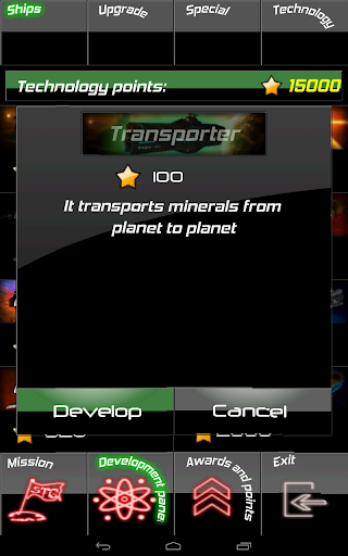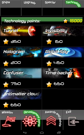 7 technologies to raise your domination. For instance: turn back in time, planetary tunel, invisibility, hologram, antimatern layer.