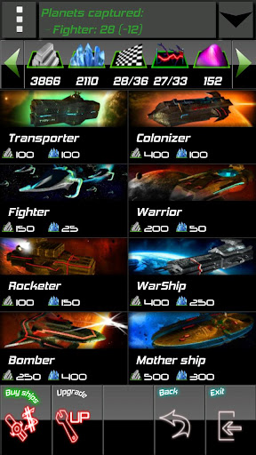 8 ships: Transporter, Fighter, Warrior, Rocketer, Warship and MotherShip.
